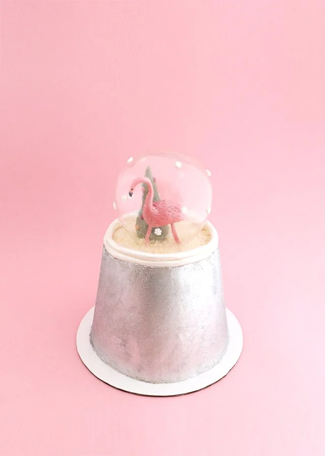 I made this cake for my friend Kelly of StudioDIY earlier this week. It was a last minute decision on my part, so it wasn't totally perfect. I would've liked the cake to be a bit smaller or the gelatin ball to be a bit larger so that there wasn't that gap between the globe and the cake's edge, but oh well! I was still pleased with it though - especially with the flamingo (balancing a little modeling chocolate flamingo body on skinny little legs is not easy!). I was also very happy to hear the survived the trip back to New Jersey with Kelly - I didn't know she had a full day planned in the city after our date...and that she had taken the bus. In hindsight, a buttercream cake is the worst gift to give someone who has that type of day planned! haTo make the globe and toppers, just follow along with my Retro Snow Globe Cupcake tutorial. Just remember, to make a larger gelatin snow globe like this one, you will need to add a bit more air to your balloons!Speaking of flamingos and the holidays, I'm off to Florida in a couple of hours and cannot wait! I hope you have a very merry Christmas! Sending you all so much love!